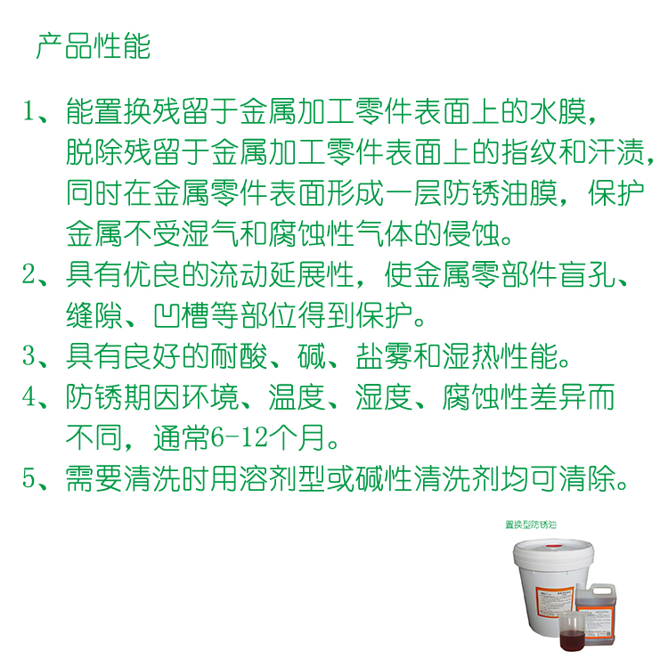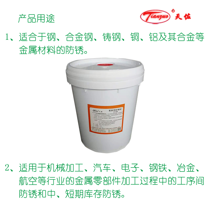 本品適用於鋼、銅、鋁等多種金屬機械加工、精(jīng)密零件加工工序間及製品存儲防鏽。具有用量少、無異味、無毒、無腐蝕性,安全方便的(de)特點。根據零部件的材質或季節的不同可防鏽一至二年。